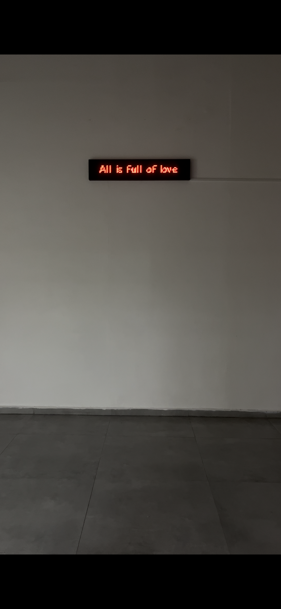 Outside the gallery, a 350-meter LED banner spanning the stadium’s façade displayed a large-scale text piece—soft, humorous, and optimistic—offering a poetic interruption to the city’s public rhythm. Within the gallery, additional LED panels presented shifting images and trilingual texts in Hebrew, Arabic, and English, inviting visitors into a gentle, multilingual dialogue in a place usually charged with intensity and division.